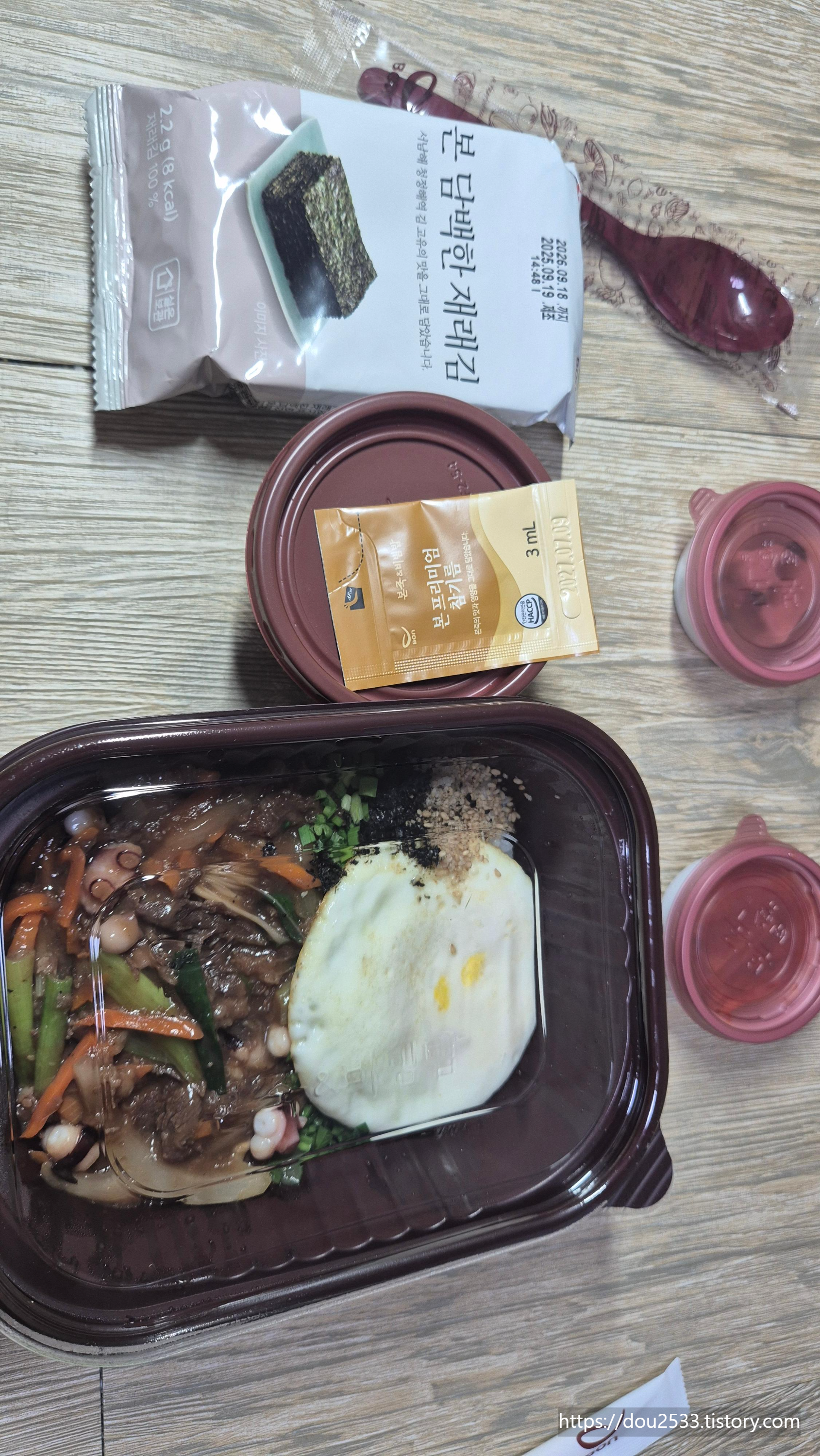 "불고기 낙지 비빔밥"을 포장해 간다.